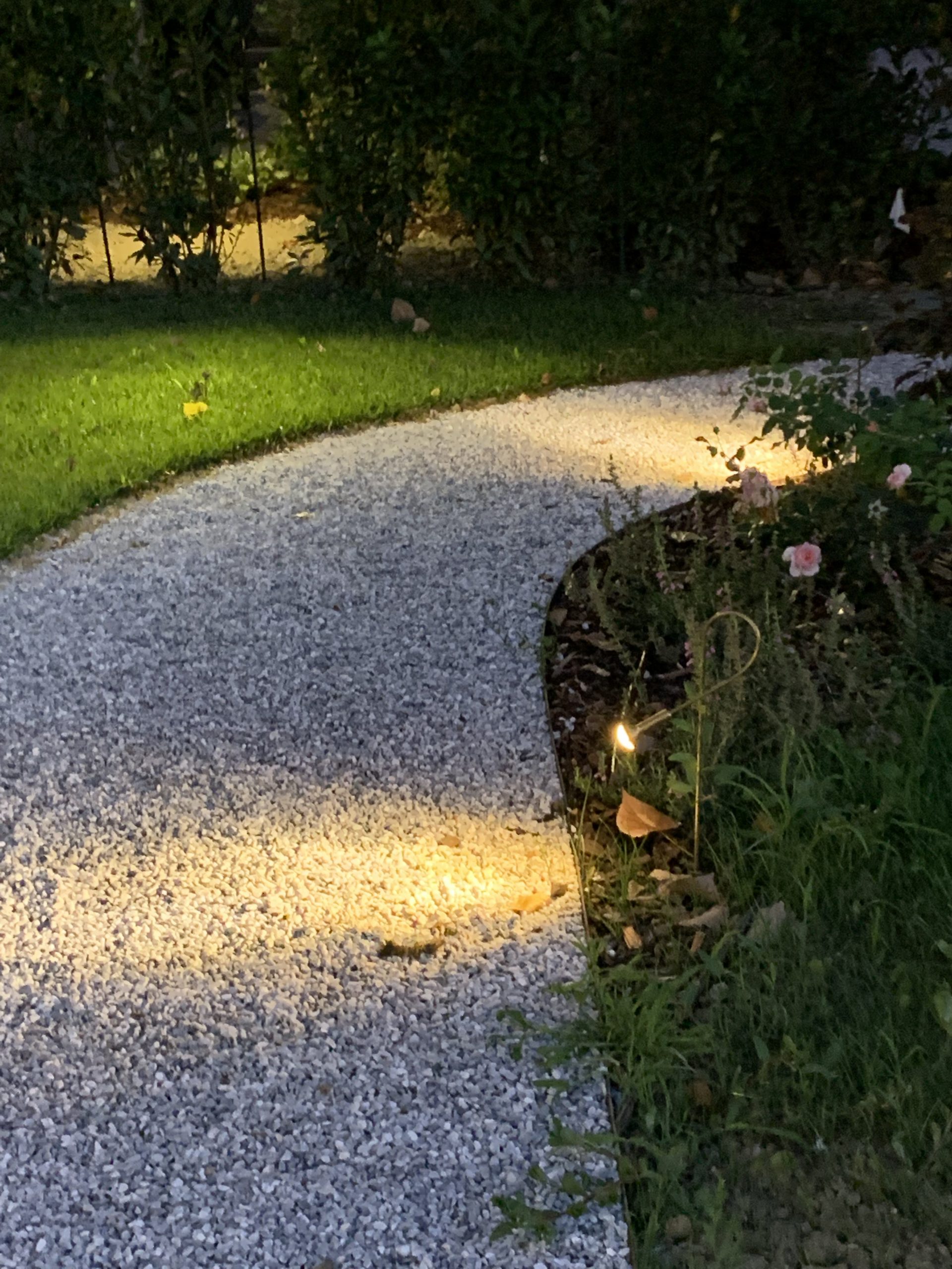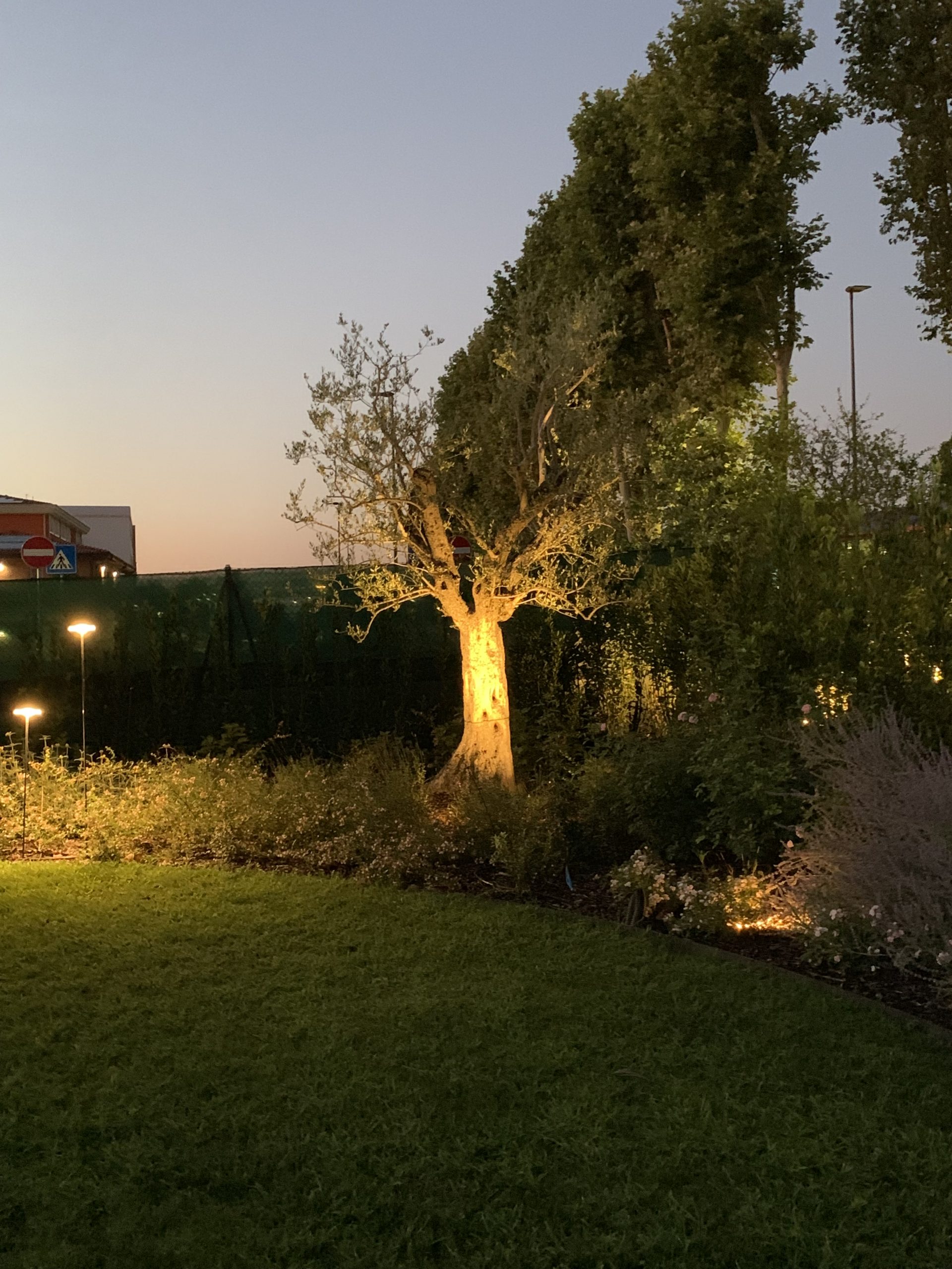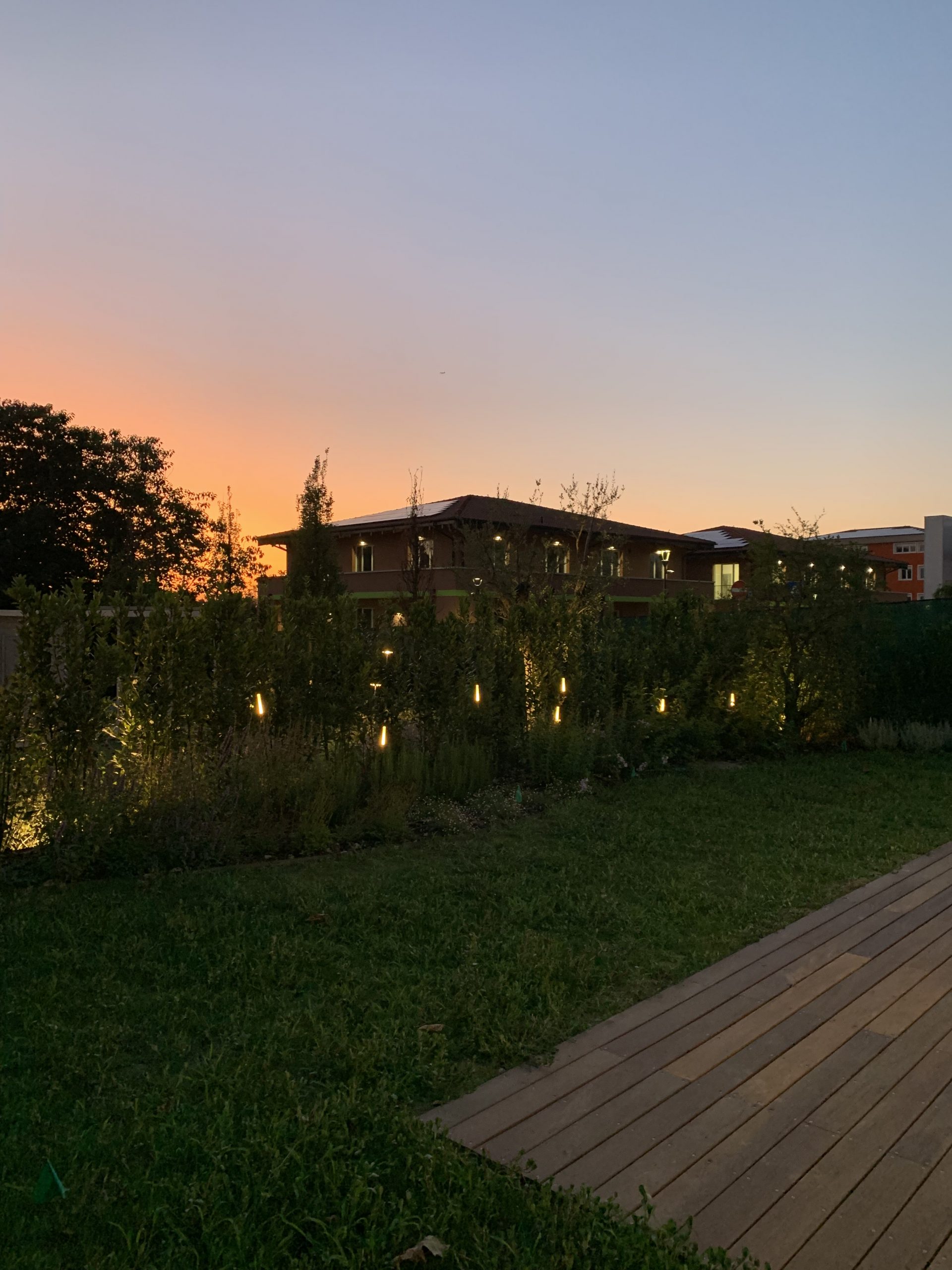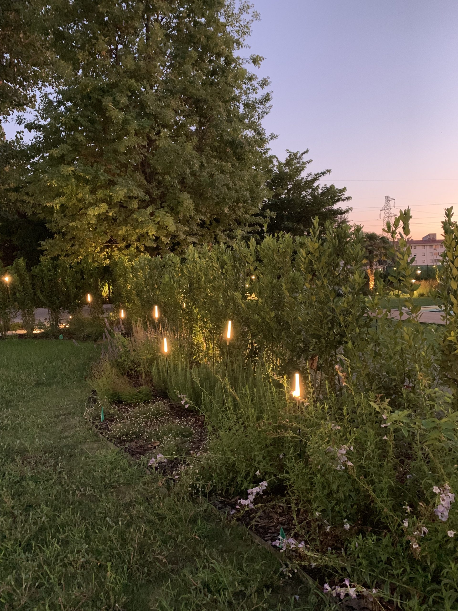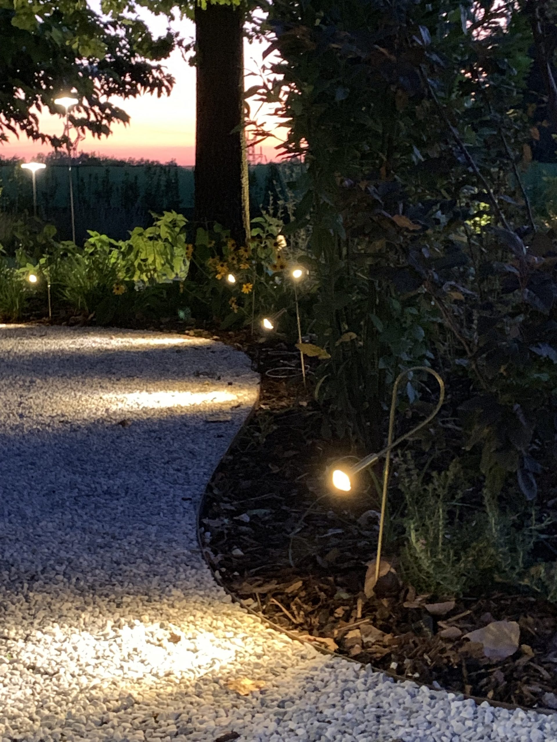 Quando ci siamo trovati a progettare l’illuminazione di questo giardino avevamo un “solo” obiettivo: riprodurre lo stesso calore e la stessa atmosfera della luce da interni, anche nel verde. Cercavamo l’equilibrio e l’interazione tra luce e elementi naturali: ecco allora i sottili steli dalla punta luminosa che “fioriscono” e si moltiplicano nella fitta vegetazione, forme semplici che si sposano con l’ambiente naturale, come se ne fossero parte integrante.